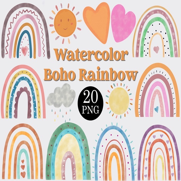 Watercolor Boho Rainbow Clipart Set