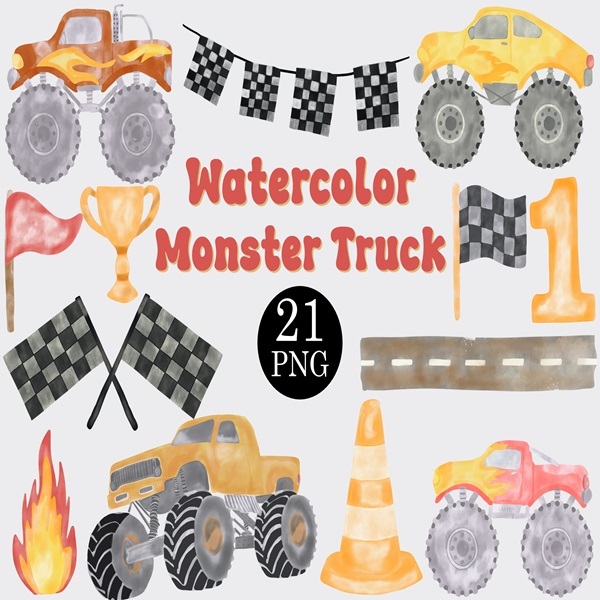 Watercolor Monster Truck Clipart Set