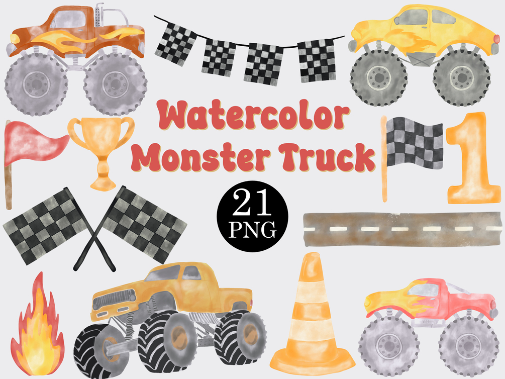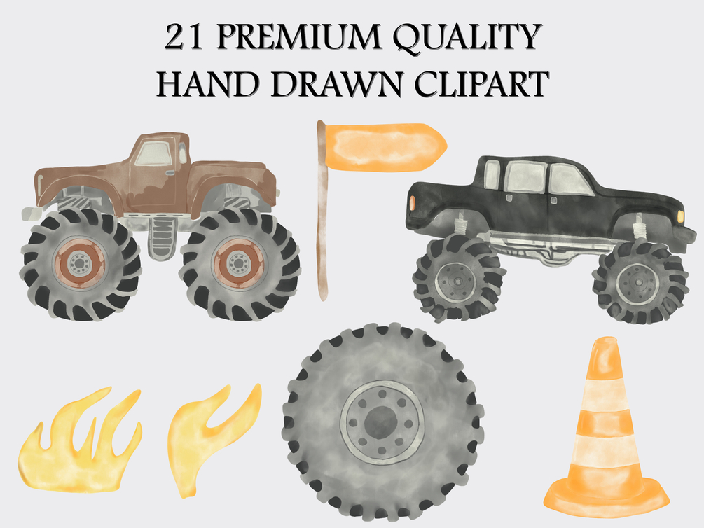 This bundle includes 21 unique Monster Truck clipart in PNG format with transparent backgrounds, making it easy to add them to your designs without any hassle. The files are high resolution, so you can scale them up or down without losing quality.