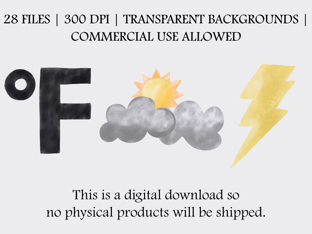 This bundle includes 28 unique Weather clipart in PNG format with transparent backgrounds, making it easy to add them to your designs without any hassle. The files are high resolution, so you can scale them up or down without losing quality.